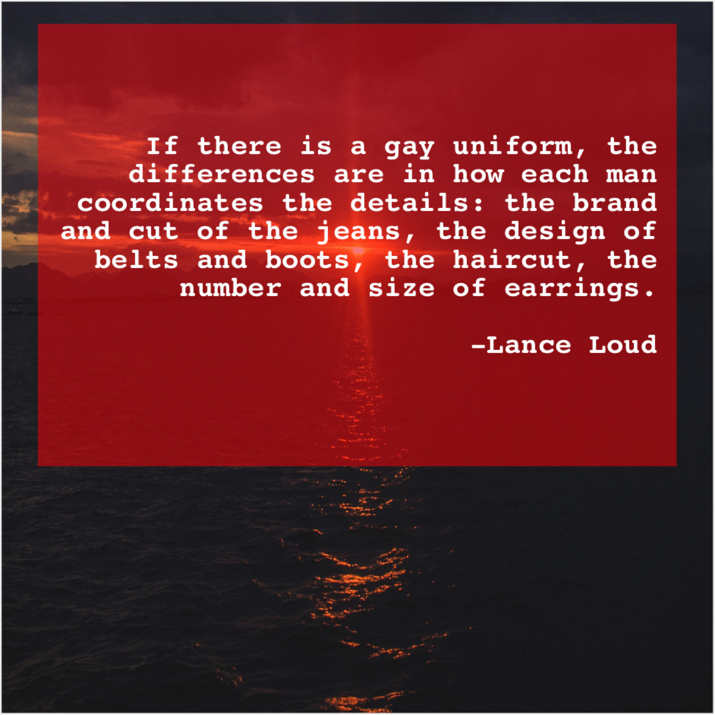 Lance Loud Lance Loud – If there is a gay… July 13, 2019 admin “If there is a gay uniform, the differences are in how each man coordinates the details: the brand and cut of the jeans, the design of belts and boots, the haircut, the number and size of earrings.”-Lance Loud