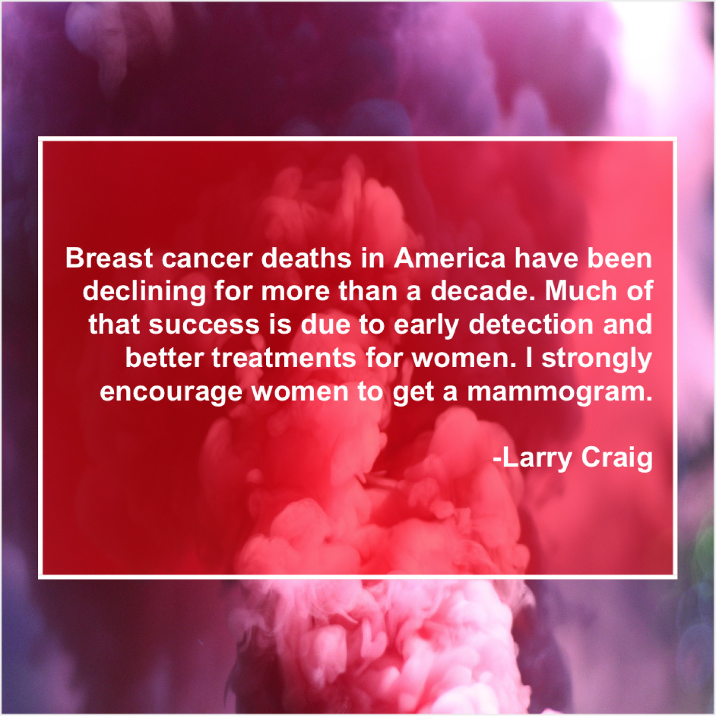 Larry Craig Larry Craig – Breast cancer deaths in America… April 3, 2019 admin “Breast cancer deaths in America have been declining for more than a decade. Much of that success is due to early detection and better treatments for women. I strongly encourage women to get a mammogram.”-Larry Craig
