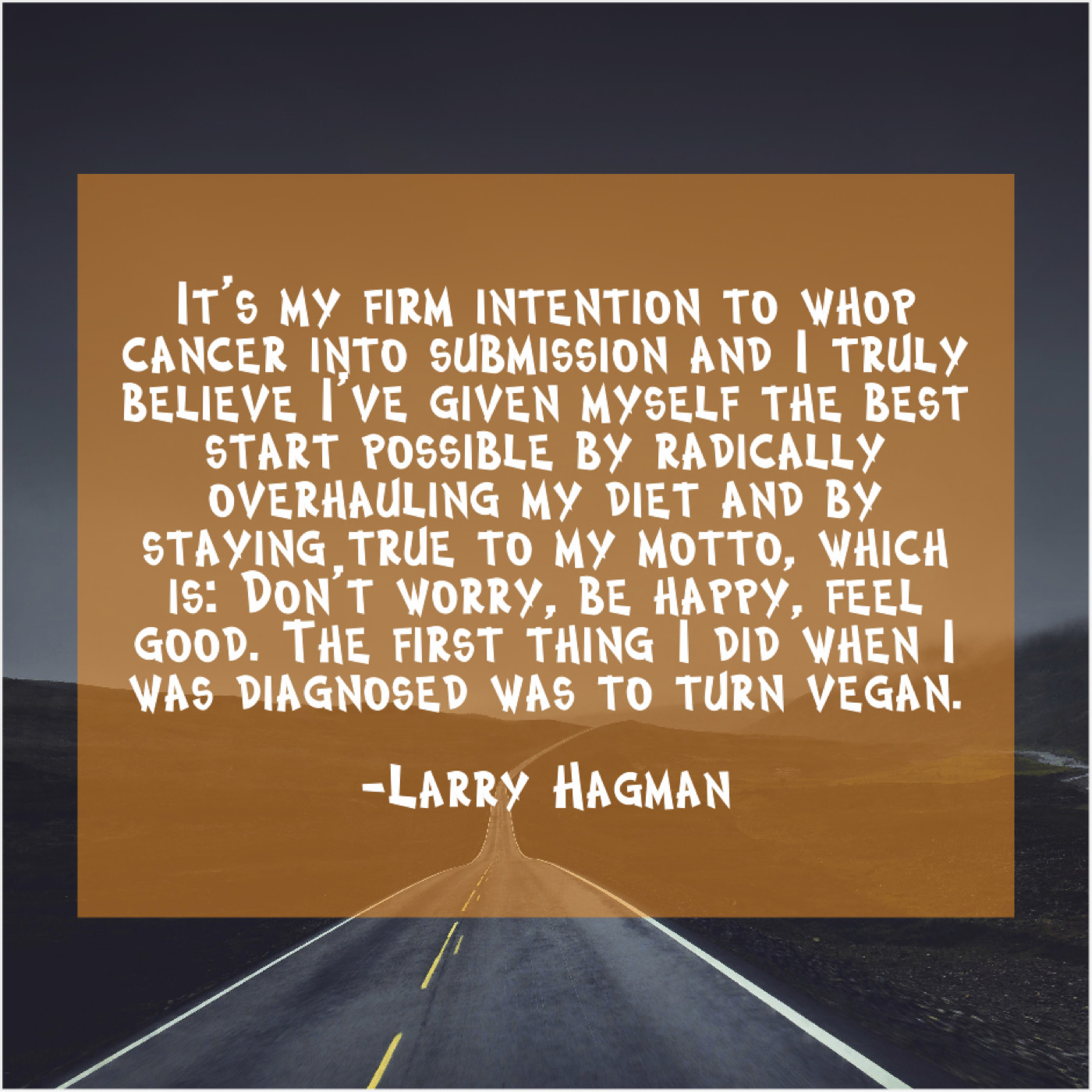 “It’s my firm intention to whop cancer into submission and I truly believe I’ve given myself the best start possible by radically overhauling my diet and by staying true to my motto, which is: Don’t worry, be happy, feel good. The first thing I did when I was diagnosed was to turn vegan.”