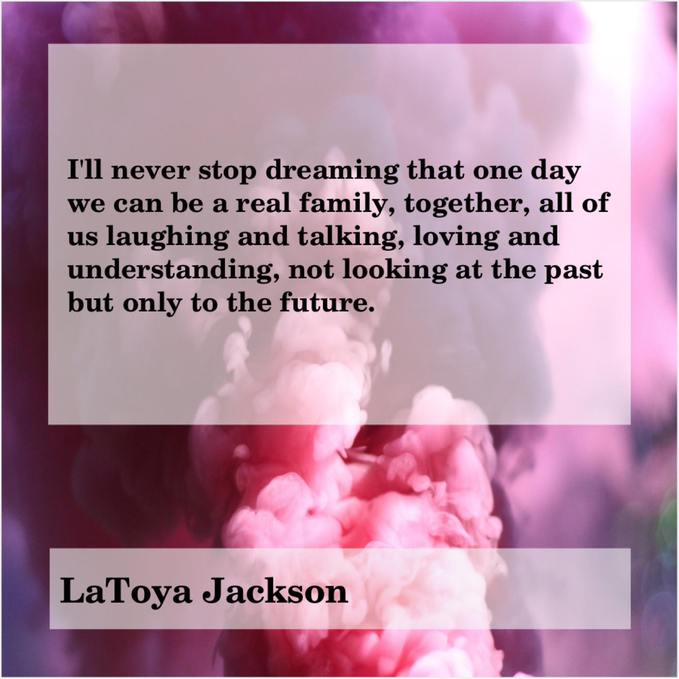 LaToya Jackson LaToya Jackson – I’ll never stop dreaming that… November 18, 2018 admin “I’ll never stop dreaming that one day we can be a real family, together, all of us laughing and talking, loving and understanding, not looking at the past but only to the future.”-LaToya Jackson