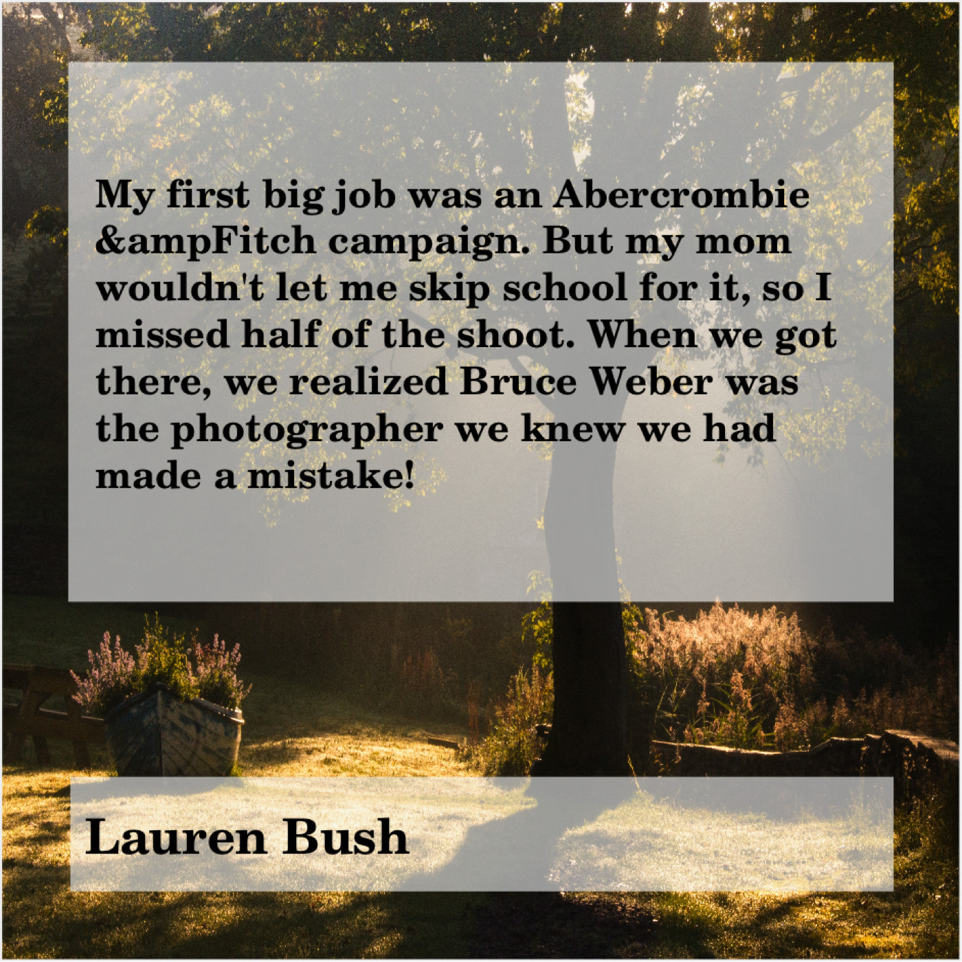 Lauren Bush Lauren Bush – My first big job was… July 2, 2019 admin “My first big job was an Abercrombie &Fitch campaign. But my mom wouldn’t let me skip school for it, so I missed half of the shoot. When we got there, we realized Bruce Weber was the photographer we knew we had made a mistake!”-Lauren Bush
