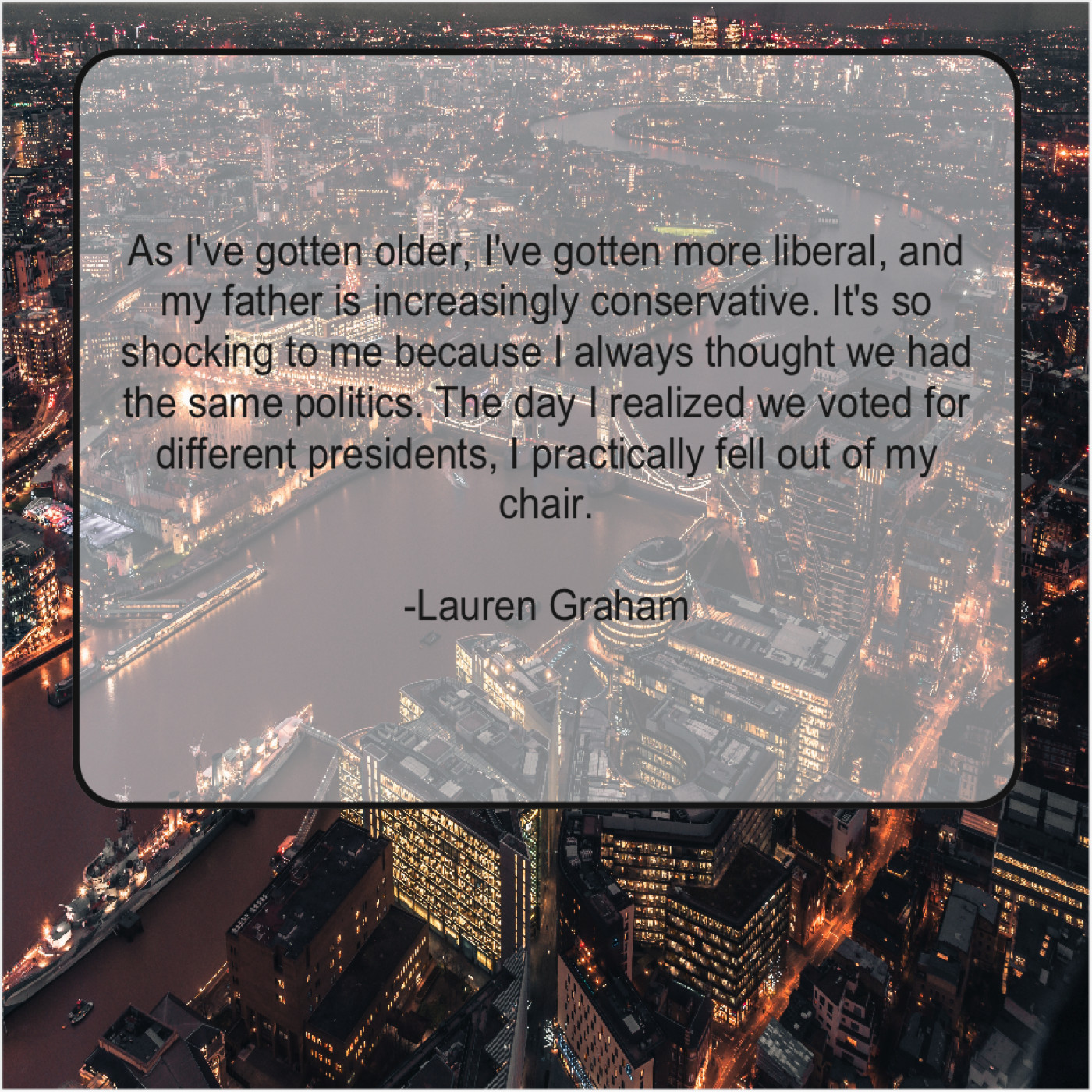 “As I’ve gotten older, I’ve gotten more liberal, and my father is increasingly conservative. It’s so shocking to me because I always thought we had the same politics. The day I realized we voted for different presidents, I practically fell out of my chair.”