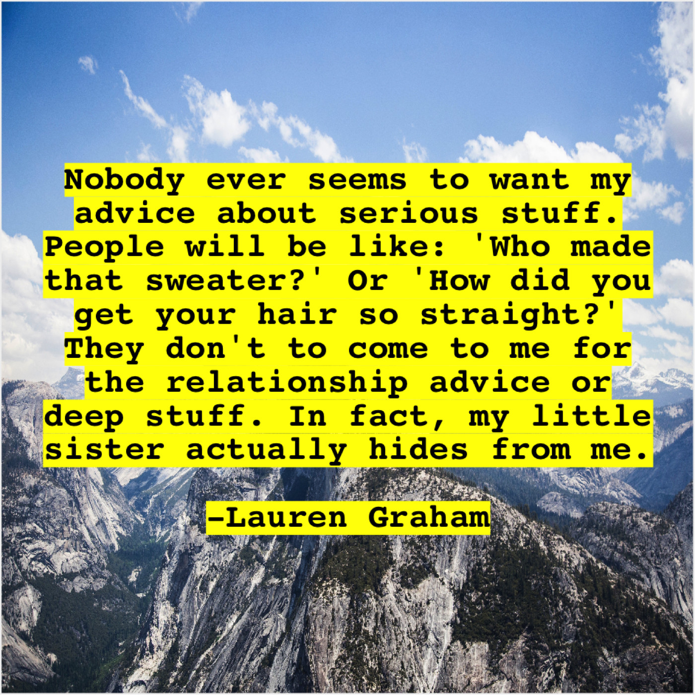 “Nobody ever seems to want my advice about serious stuff. People will be like: ‘Who made that sweater?’ Or ‘How did you get your hair so straight?’ They don’t to come to me for the relationship advice or deep stuff. In fact, my little sister actually hides from me.”