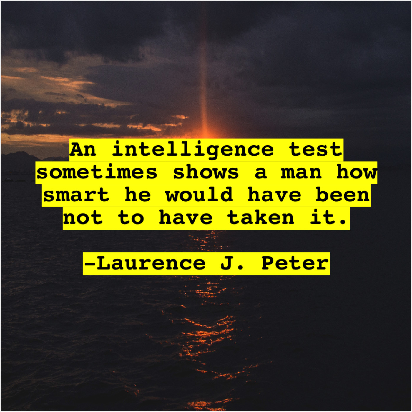 Laurence J. Peter Laurence J. Peter – An intelligence test sometimes shows… September 12, 2019 admin “An intelligence test sometimes shows a man how smart he would have been not to have taken it.”-Laurence J. Peter