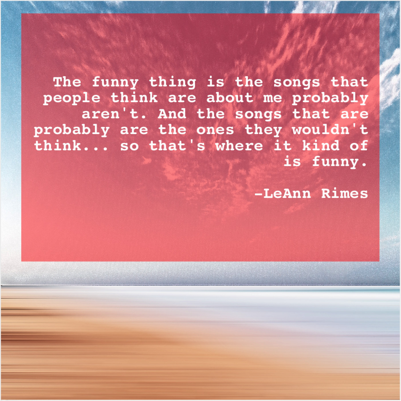 LeAnn Rimes LeAnn Rimes – The funny thing is the… June 7, 2019 admin “The funny thing is the songs that people think are about me probably aren’t. And the songs that are probably are the ones they wouldn’t think… so that’s where it kind of is funny.”-LeAnn Rimes