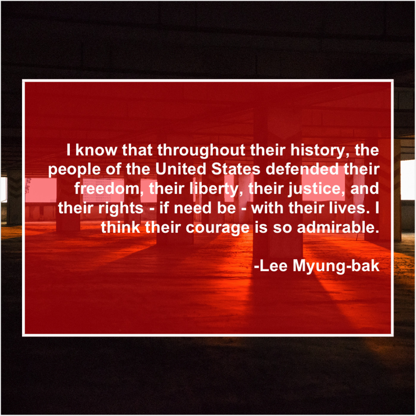 Lee Myung-bak Lee Myung-bak – I know that throughout their… May 8, 2019 admin “I know that throughout their history, the people of the United States defended their freedom, their liberty, their justice, and their rights – if need be – with their lives. I think their courage is so admirable.”-Lee Myung-bak