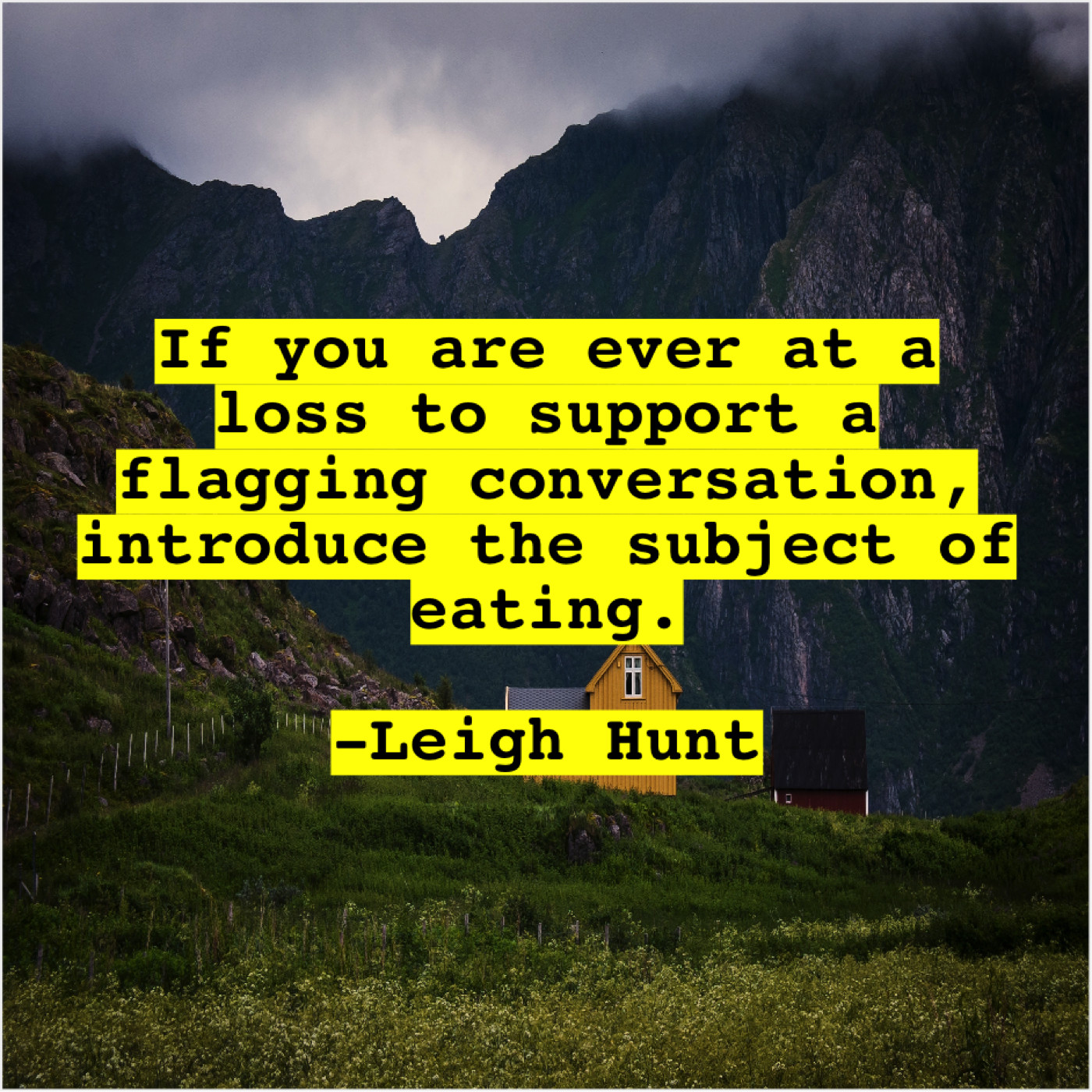 Leigh Hunt Leigh Hunt – If you are ever at… January 24, 2019 admin “If you are ever at a loss to support a flagging conversation, introduce the subject of eating.”-Leigh Hunt