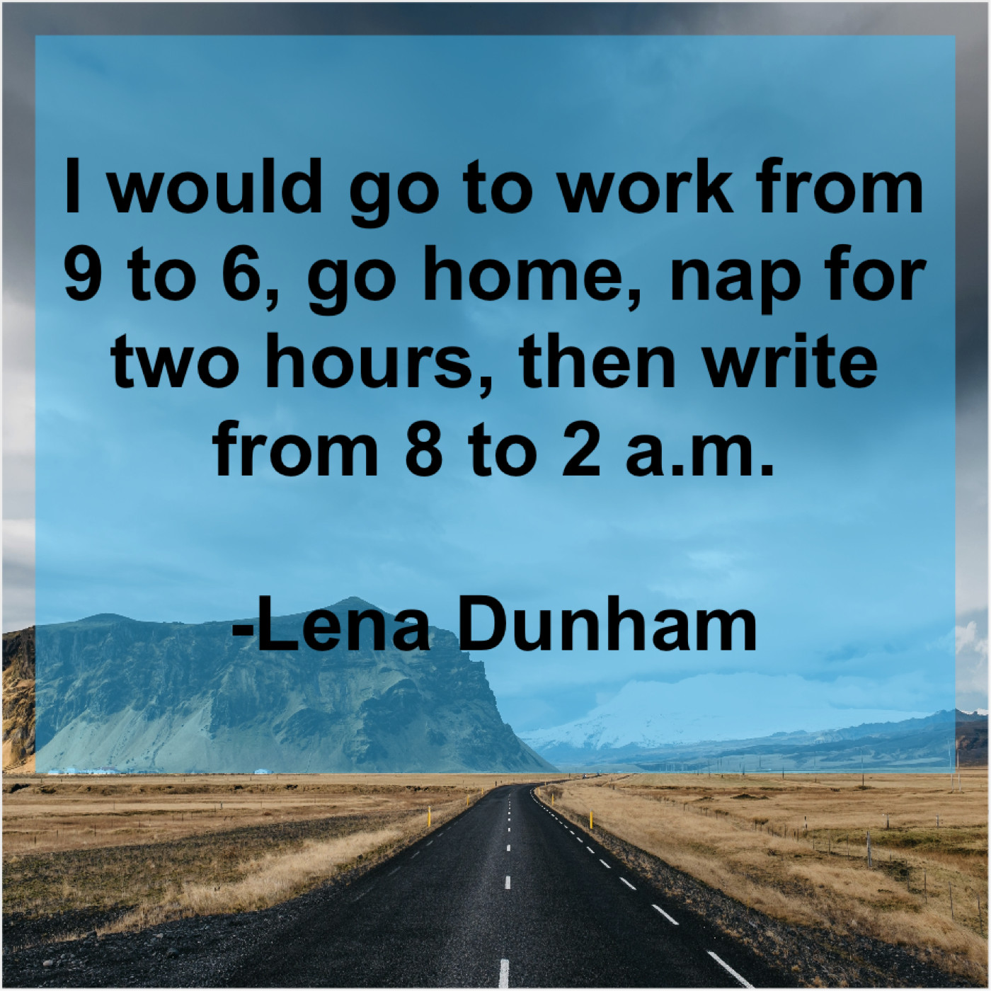 Lena Dunham Lena Dunham – I would go to work… October 3, 2019 admin “I would go to work from 9 to 6, go home, nap for two hours, then write from 8 to 2 a.m.”-Lena Dunham