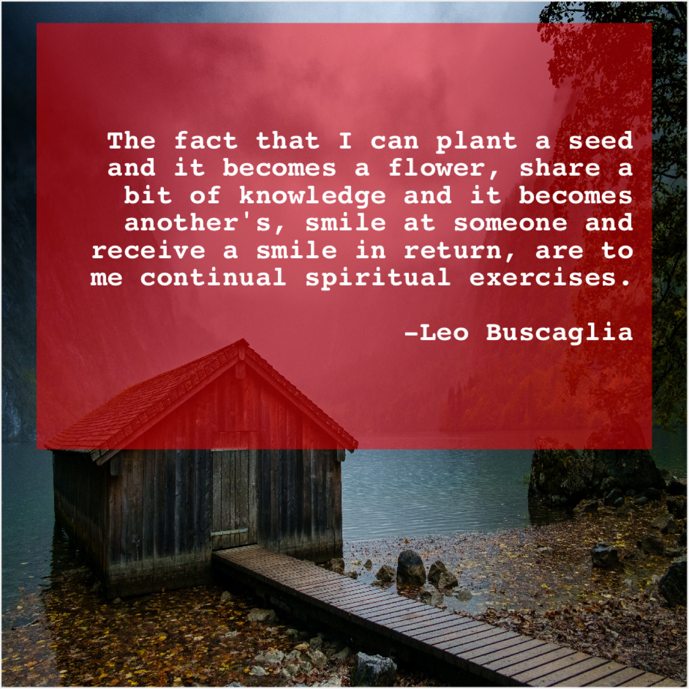 Leo Buscaglia Leo Buscaglia – The fact that I can… July 12, 2019 admin “The fact that I can plant a seed and it becomes a flower, share a bit of knowledge and it becomes another’s, smile at someone and receive a smile in return, are to me continual spiritual exercises.”-Leo Buscaglia