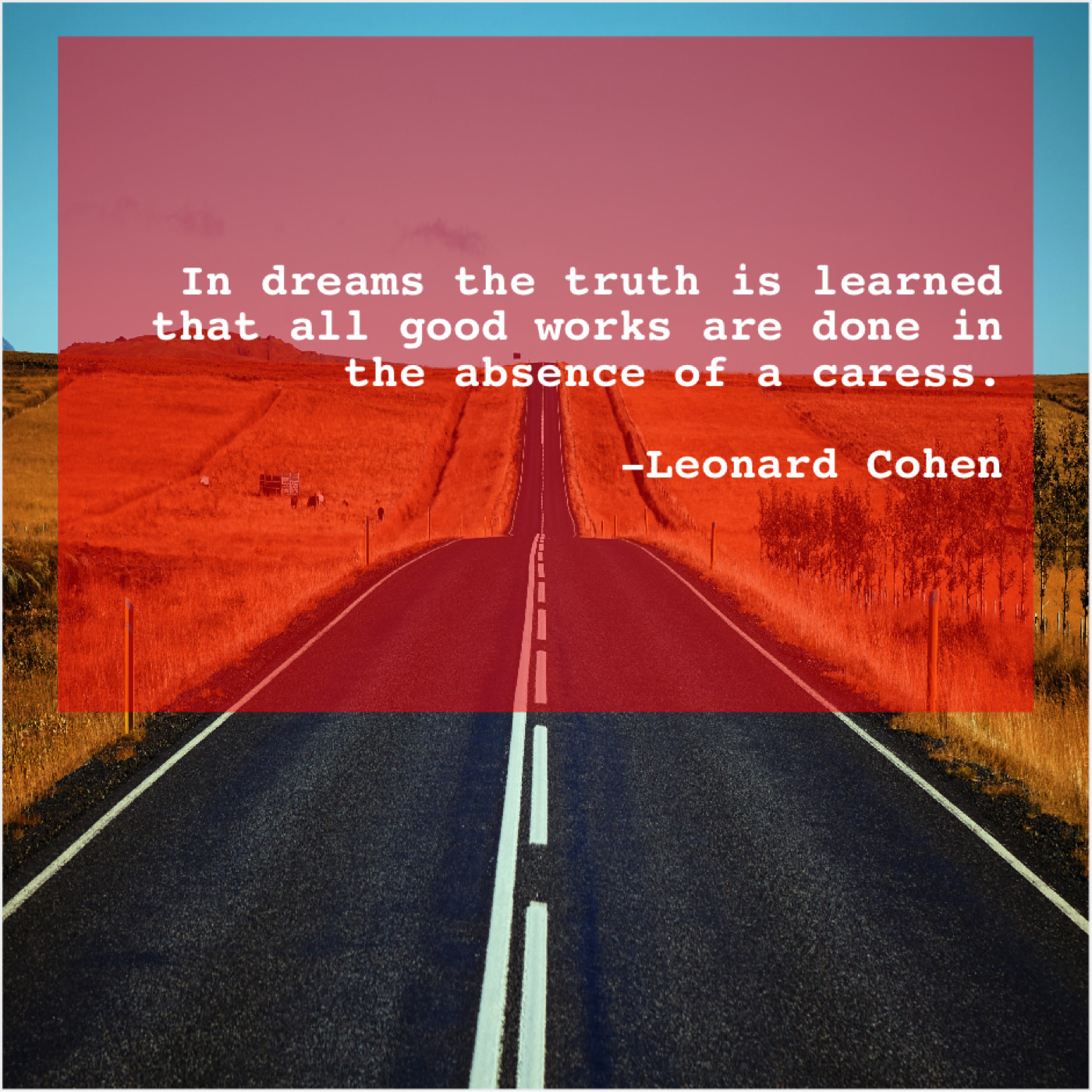 Leonard Cohen Leonard Cohen – In dreams the truth is… April 26, 2019 admin “In dreams the truth is learned that all good works are done in the absence of a caress.”-Leonard Cohen