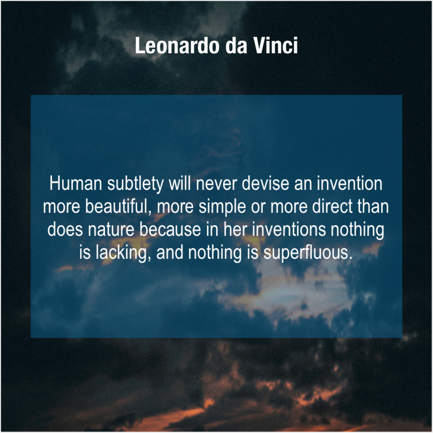 Leonardo da Vinci Leonardo da Vinci – Human subtlety will never devise… October 13, 2019 admin “Human subtlety will never devise an invention more beautiful, more simple or more direct than does nature because in her inventions nothing is lacking, and nothing is superfluous.”-Leonardo da Vinci
