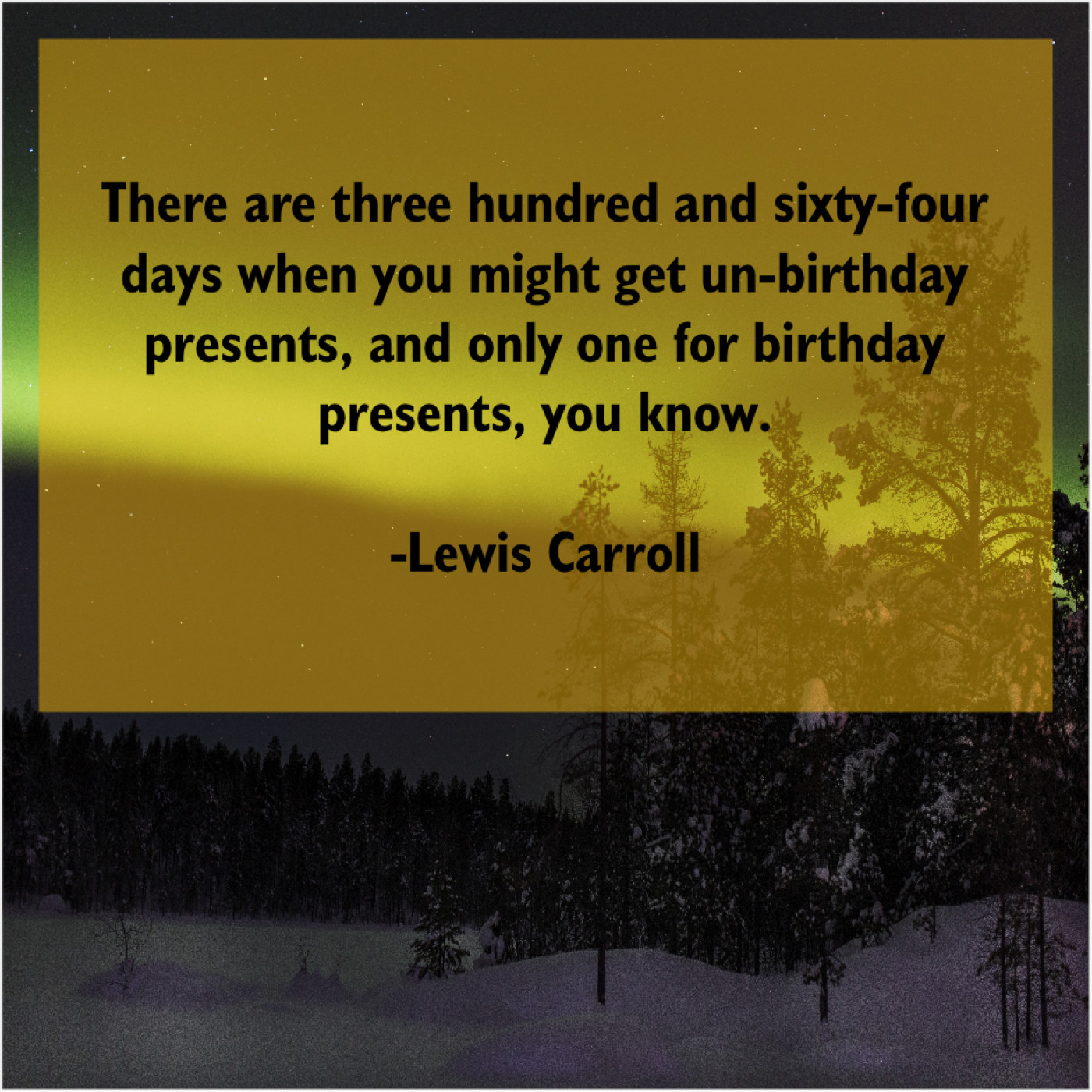Lewis Carroll Lewis Carroll – There are three hundred and… December 17, 2018 admin “There are three hundred and sixty-four days when you might get un-birthday presents, and only one for birthday presents, you know.”-Lewis Carroll
