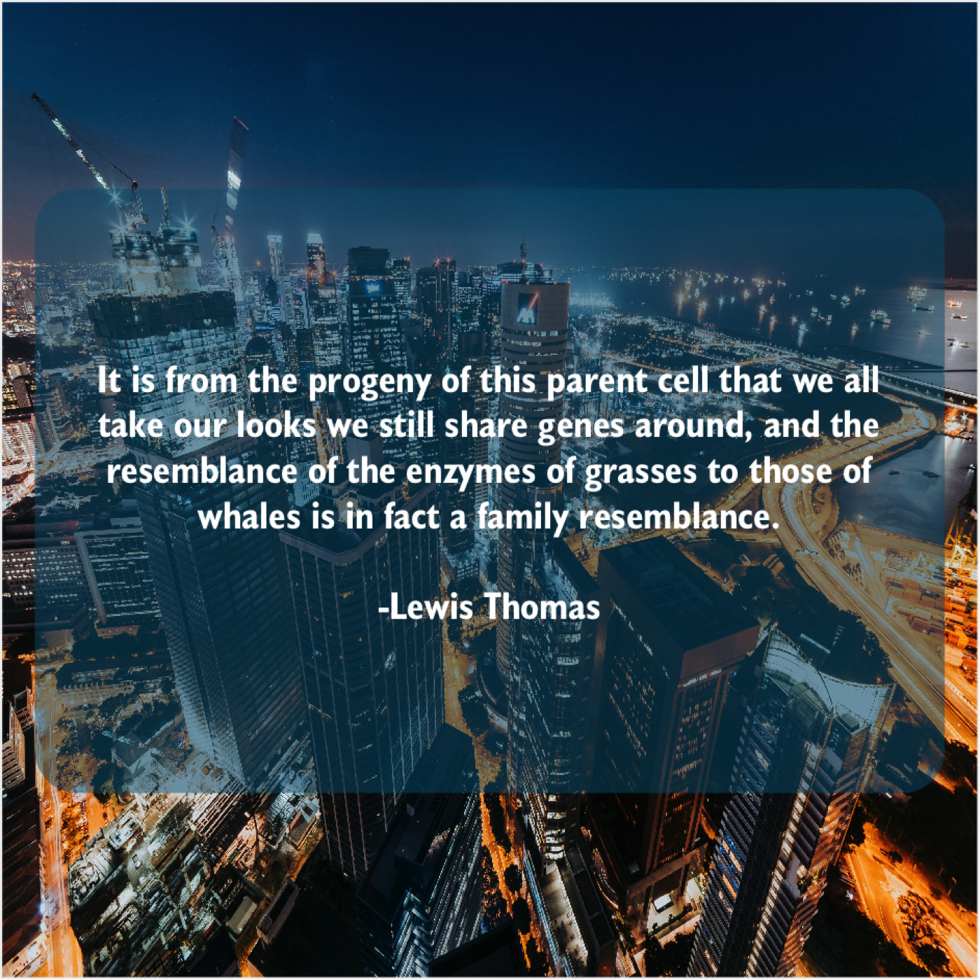 Lewis Thomas Lewis Thomas – It is from the progeny… August 19, 2019 admin “It is from the progeny of this parent cell that we all take our looks we still share genes around, and the resemblance of the enzymes of grasses to those of whales is in fact a family resemblance.”-Lewis Thomas