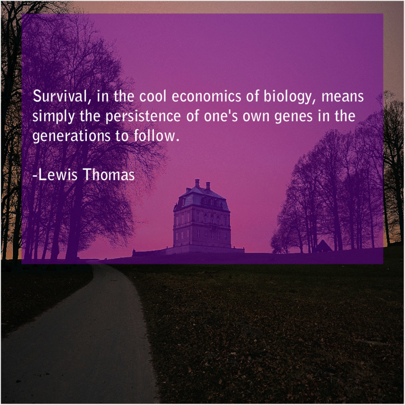 Lewis Thomas Lewis Thomas – Survival, in the cool economics… June 22, 2019 admin “Survival, in the cool economics of biology, means simply the persistence of one’s own genes in the generations to follow.”-Lewis Thomas