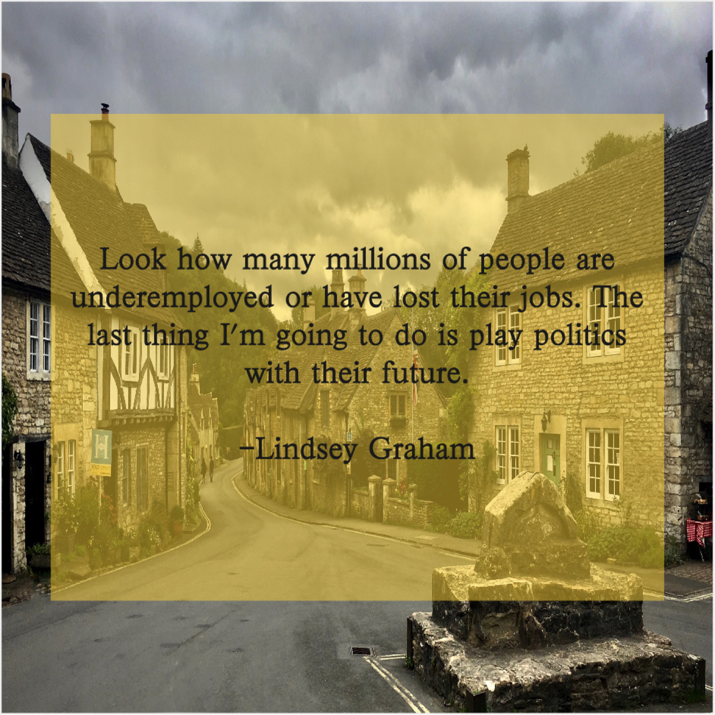 Lindsey Graham Lindsey Graham – Look how many millions of… August 15, 2019 admin “Look how many millions of people are underemployed or have lost their jobs. The last thing I’m going to do is play politics with their future.”-Lindsey Graham