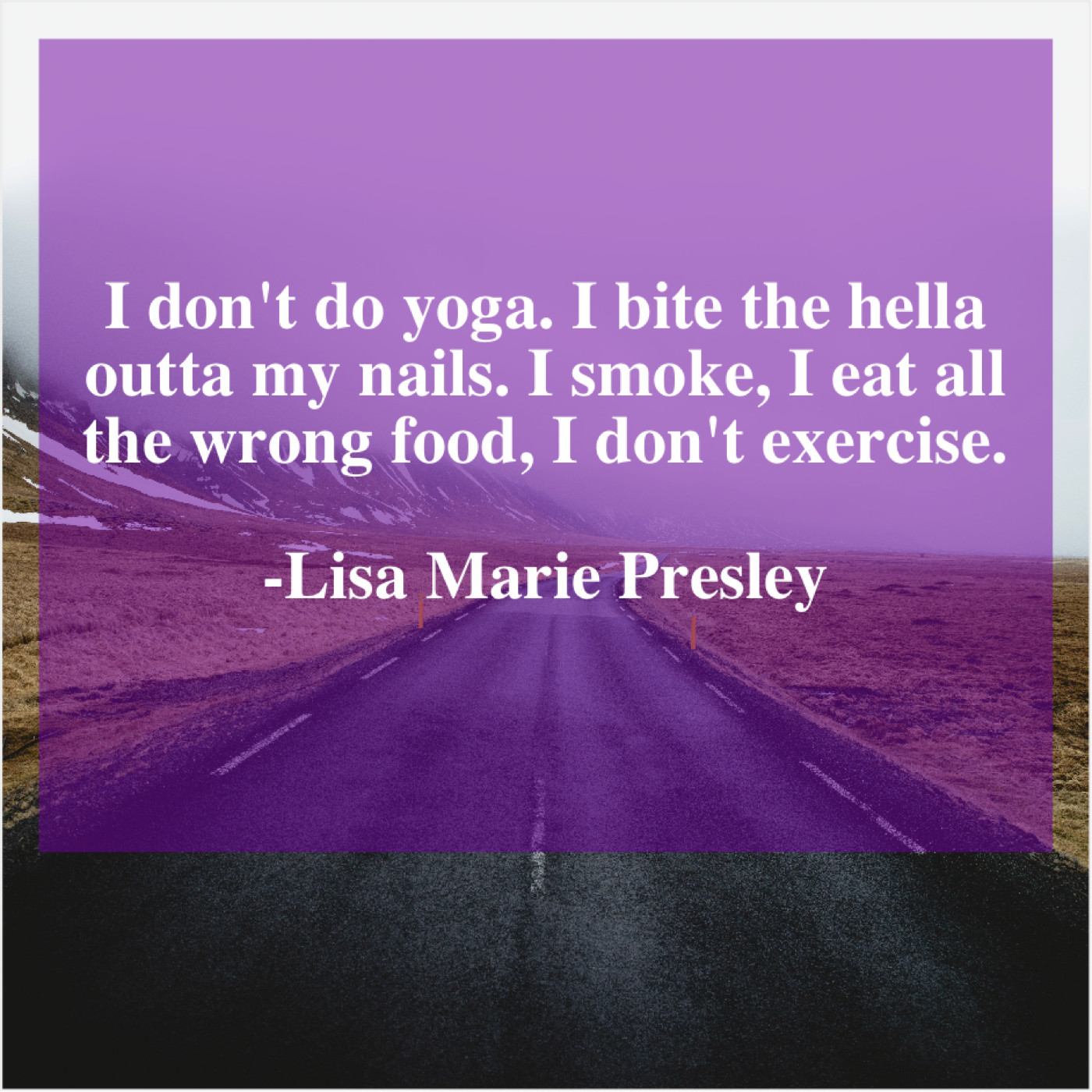 Lisa Marie Presley Lisa Marie Presley – I don’t do yoga. I… July 2, 2019 admin “I don’t do yoga. I bite the hella outta my nails. I smoke, I eat all the wrong food, I don’t exercise.”-Lisa Marie Presley