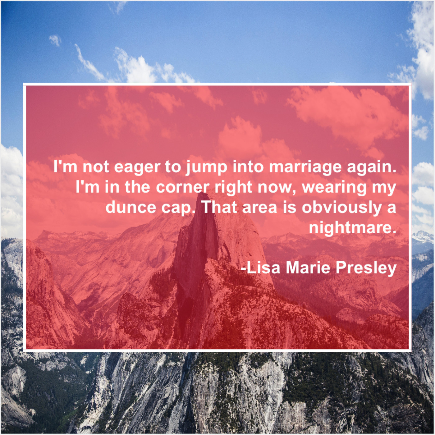 Lisa Marie Presley Lisa Marie Presley – I’m not eager to jump… July 27, 2019 admin “I’m not eager to jump into marriage again. I’m in the corner right now, wearing my dunce cap. That area is obviously a nightmare.”-Lisa Marie Presley
