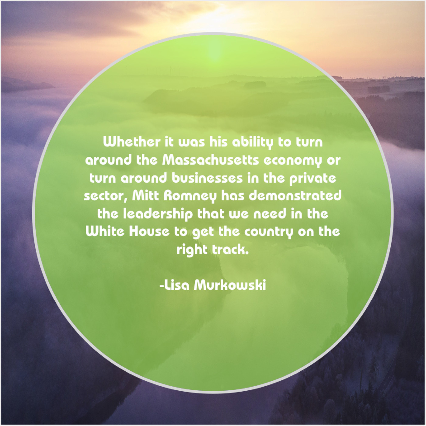 Lisa Murkowski Lisa Murkowski – Whether it was his ability… June 25, 2019 admin “Whether it was his ability to turn around the Massachusetts economy or turn around businesses in the private sector, Mitt Romney has demonstrated the leadership that we need in the White House to get the country on the right track.”-Lisa Murkowski