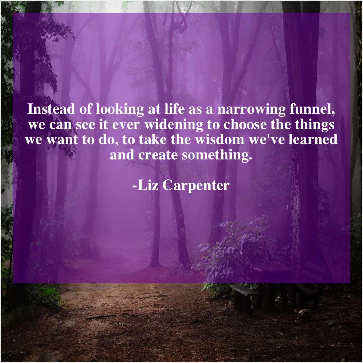 Liz Carpenter Liz Carpenter – Instead of looking at life… December 27, 2018 admin “Instead of looking at life as a narrowing funnel, we can see it ever widening to choose the things we want to do, to take the wisdom we’ve learned and create something.”-Liz Carpenter