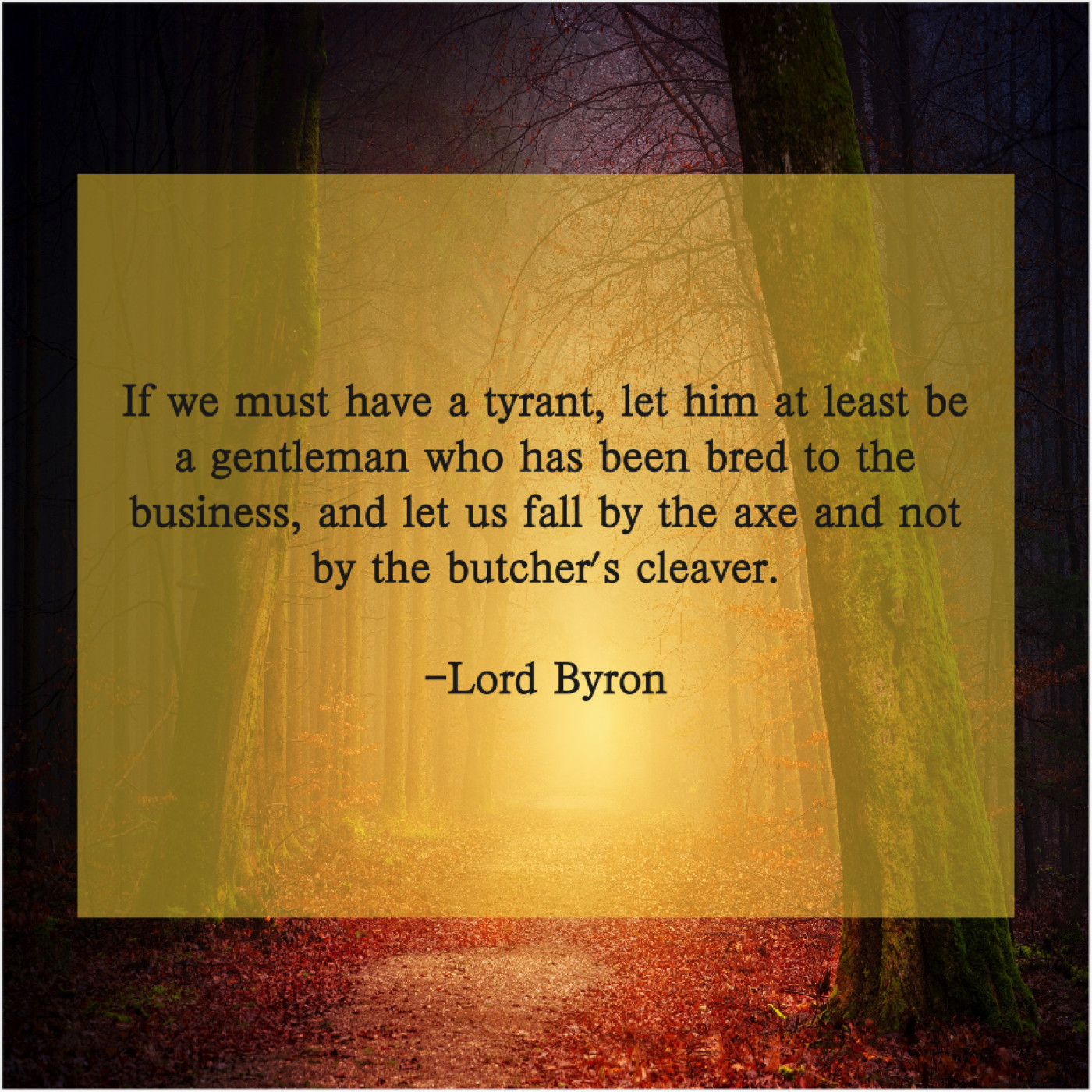 Lord Byron Lord Byron – If we must have a… June 3, 2019 admin “If we must have a tyrant, let him at least be a gentleman who has been bred to the business, and let us fall by the axe and not by the butcher’s cleaver.”-Lord Byron