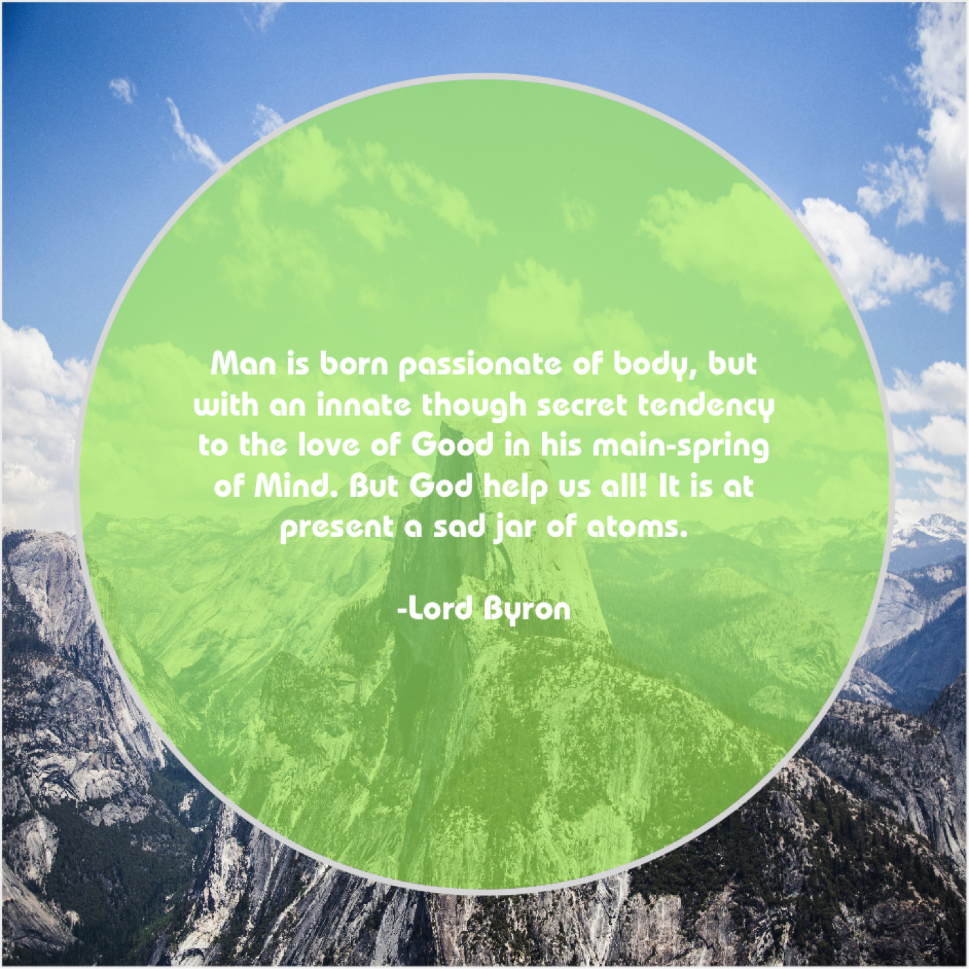 Lord Byron Lord Byron – Man is born passionate of… February 24, 2019 admin “Man is born passionate of body, but with an innate though secret tendency to the love of Good in his main-spring of Mind. But God help us all! It is at present a sad jar of atoms.”-Lord Byron