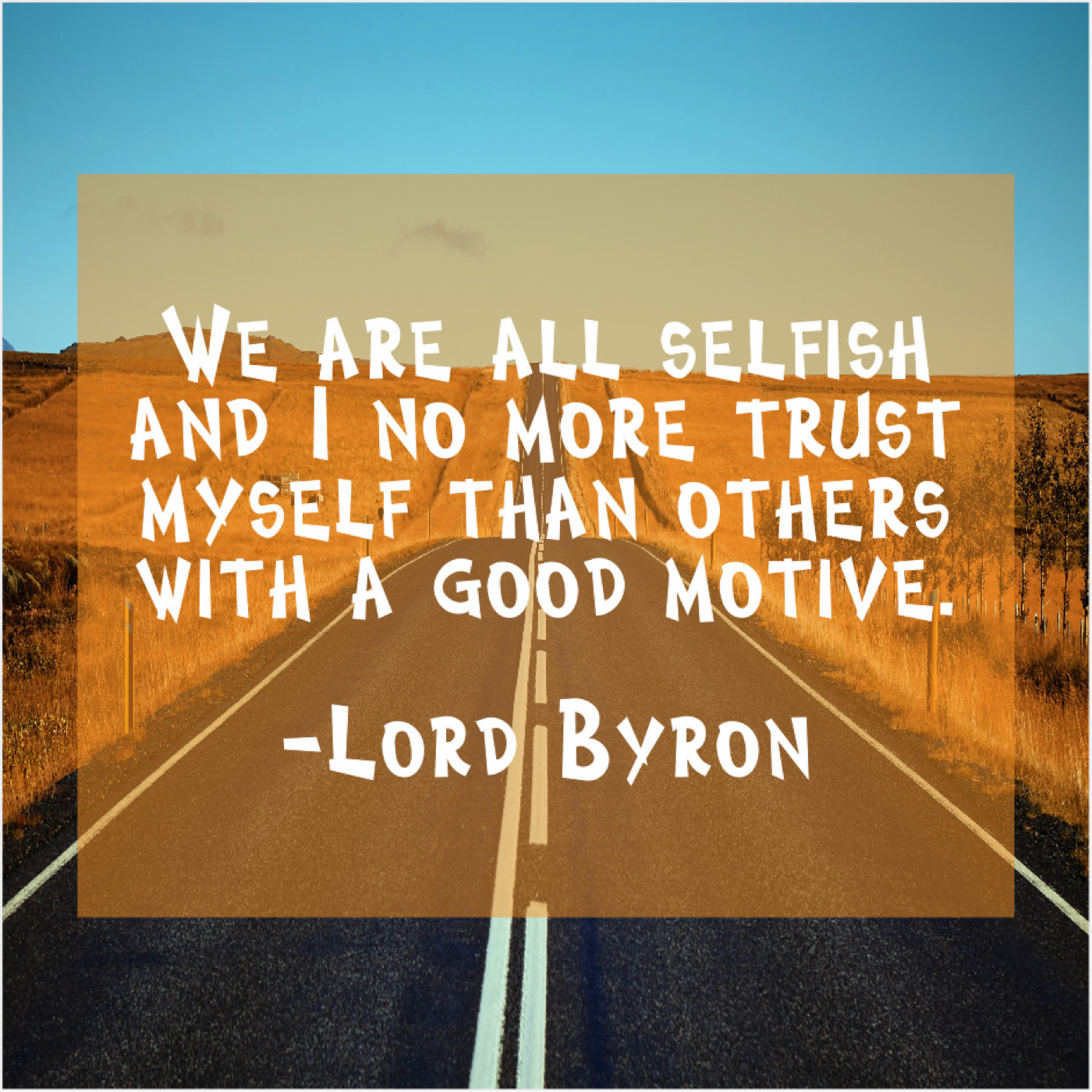 Lord Byron Lord Byron – We are all selfish and… August 11, 2019 admin “We are all selfish and I no more trust myself than others with a good motive.”-Lord Byron