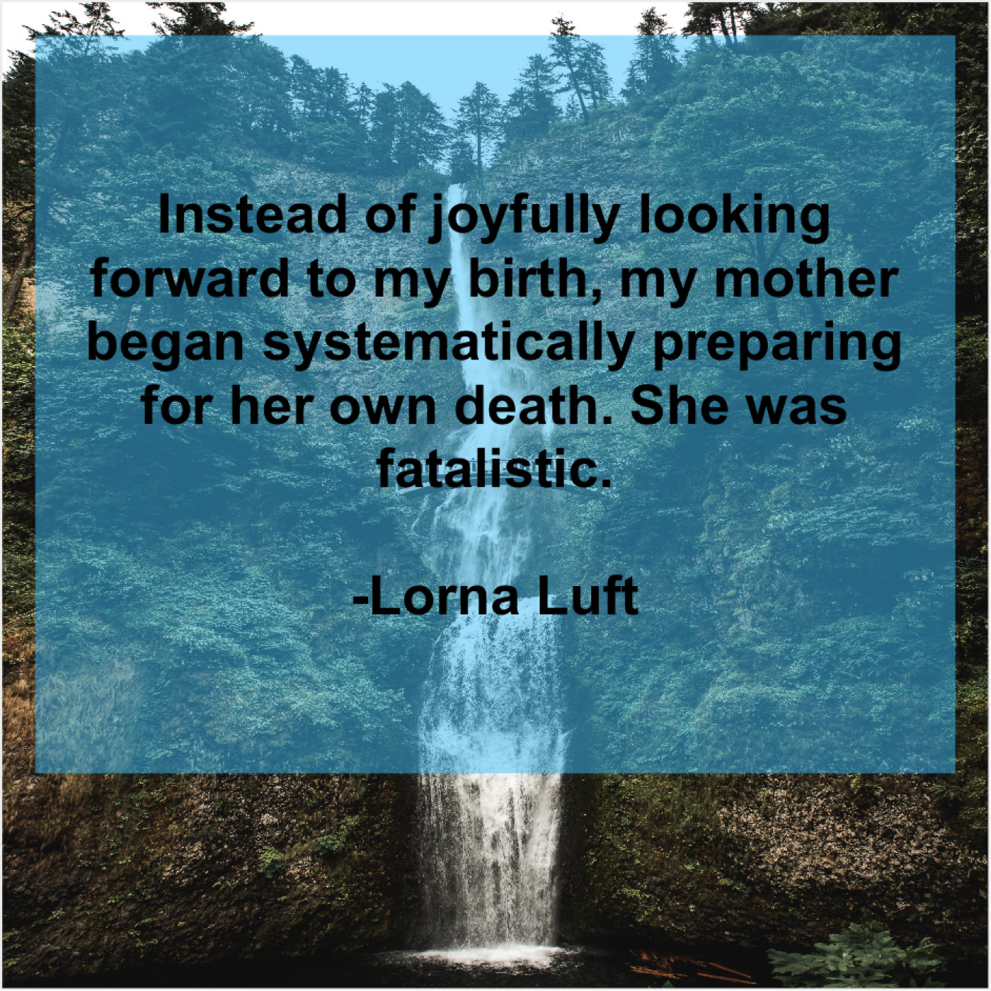 “Instead of joyfully looking forward to my birth, my mother began systematically preparing for her own death. She was fatalistic.”