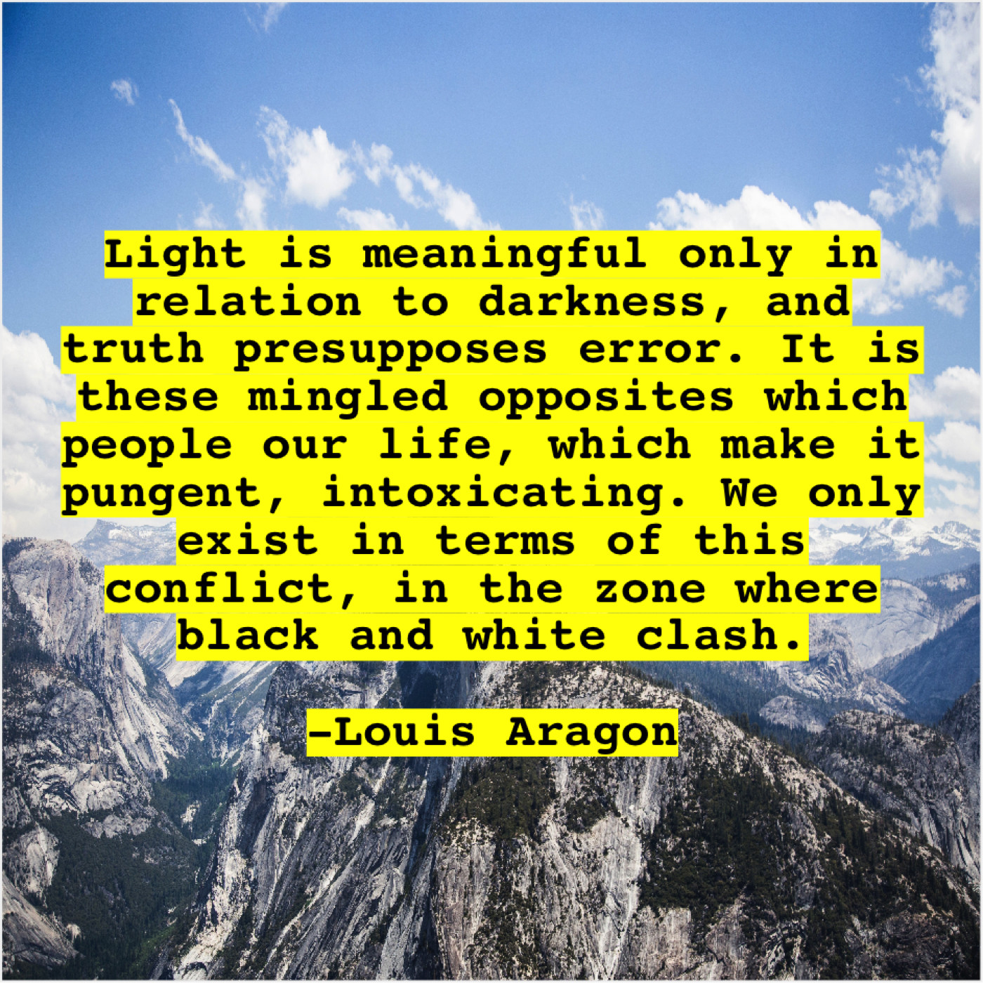 “Light is meaningful only in relation to darkness, and truth presupposes error. It is these mingled opposites which people our life, which make it pungent, intoxicating. We only exist in terms of this conflict, in the zone where black and white clash.”