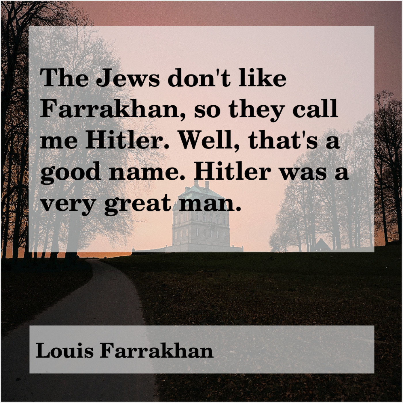 Louis Farrakhan Louis Farrakhan – The Jews don’t like Farrakhan… November 23, 2018 admin “The Jews don’t like Farrakhan, so they call me Hitler. Well, that’s a good name. Hitler was a very great man.”-Louis Farrakhan