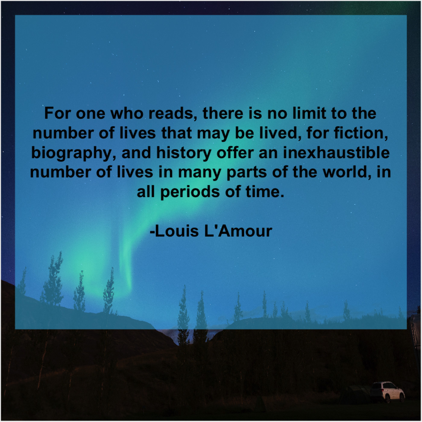 Louis L'Amour Louis L’Amour – For one who reads, there… October 5, 2019 admin “For one who reads, there is no limit to the number of lives that may be lived, for fiction, biography, and history offer an inexhaustible number of lives in many parts of the world, in all periods of time.”-Louis L’Amour