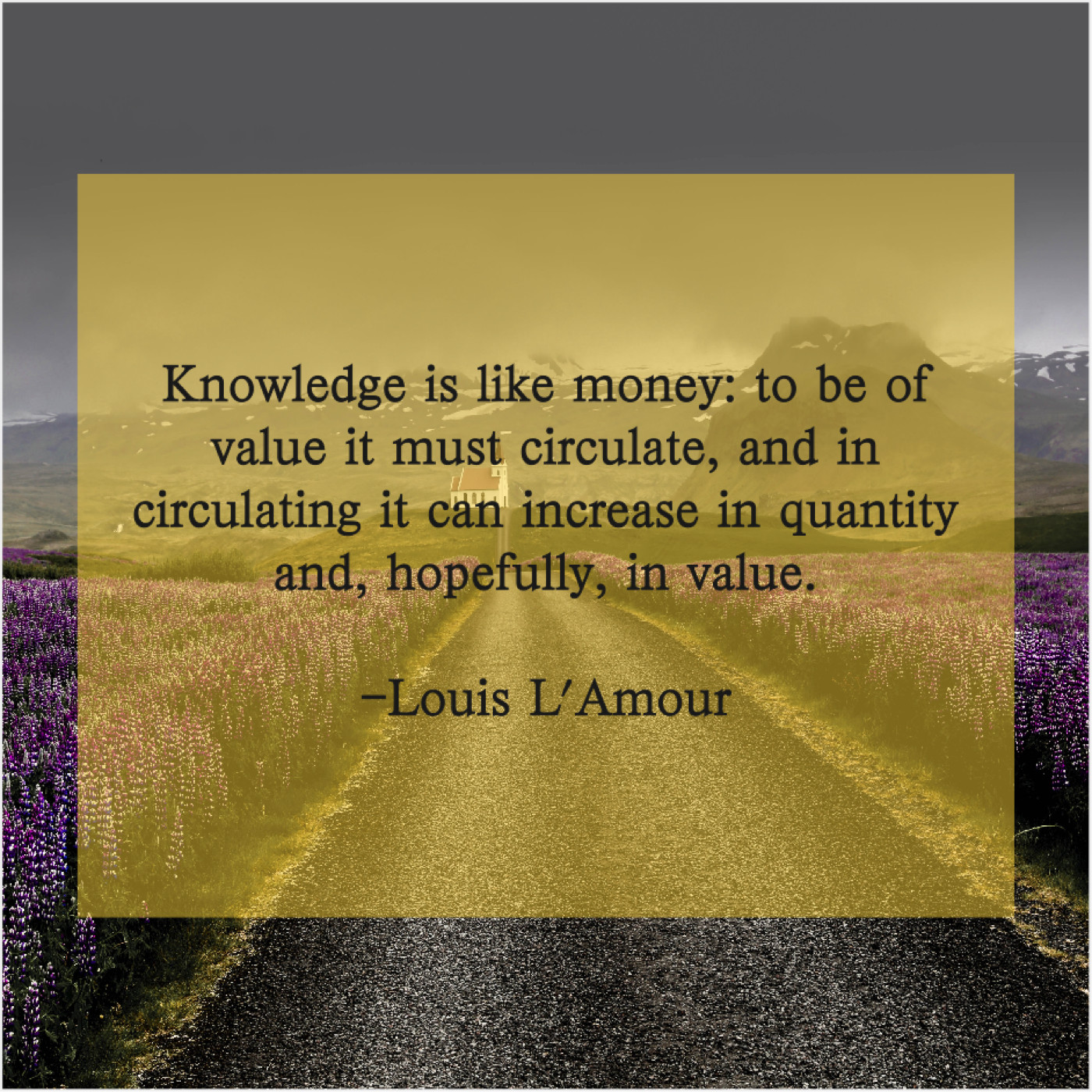 Louis L'Amour Louis L’Amour – Knowledge is like money: to… December 1, 2018 admin “Knowledge is like money: to be of value it must circulate, and in circulating it can increase in quantity and, hopefully, in value.”-Louis L’Amour