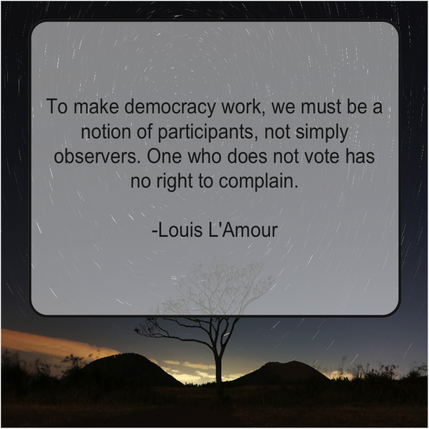 Louis L'Amour Louis L’Amour – To make democracy work, we… September 12, 2019 admin “To make democracy work, we must be a notion of participants, not simply observers. One who does not vote has no right to complain.”-Louis L’Amour