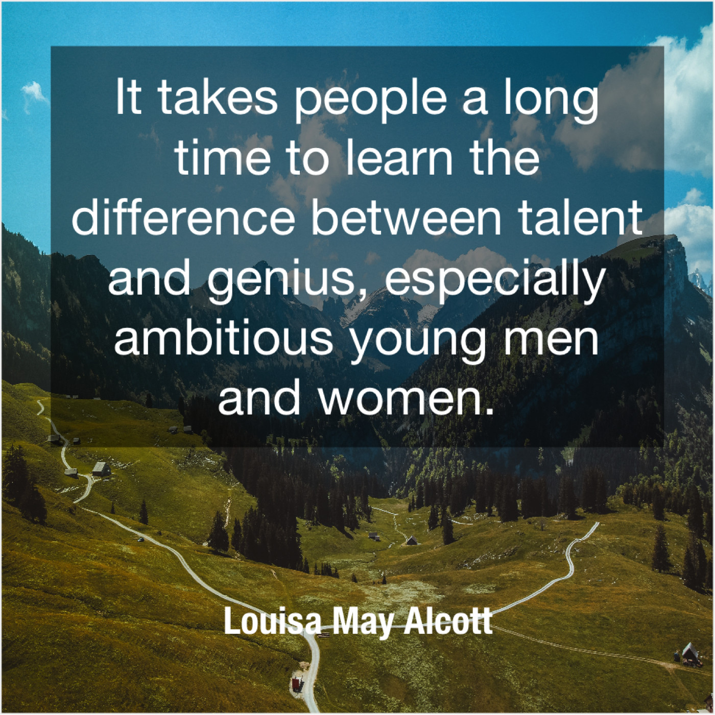 Louisa May Alcott Louisa May Alcott – It takes people a long… November 18, 2018 admin “It takes people a long time to learn the difference between talent and genius, especially ambitious young men and women.”-Louisa May Alcott