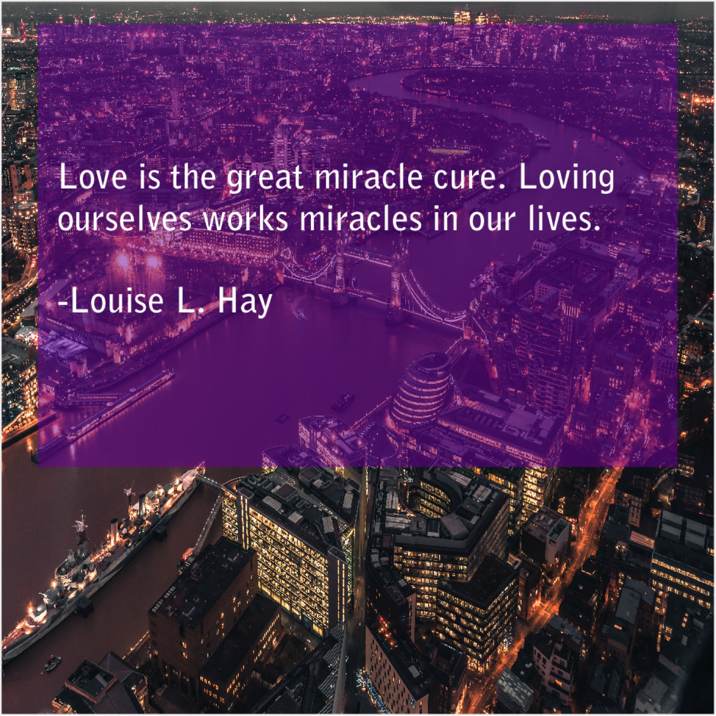Louise L. Hay Louise L. Hay – Love is the great miracle… March 26, 2019 admin “Love is the great miracle cure. Loving ourselves works miracles in our lives.”-Louise L. Hay