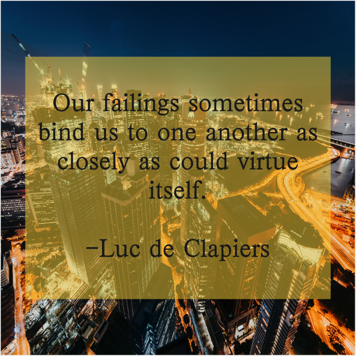Luc de Clapiers Luc de Clapiers – Our failings sometimes bind us… June 6, 2019 admin “Our failings sometimes bind us to one another as closely as could virtue itself.”-Luc de Clapiers