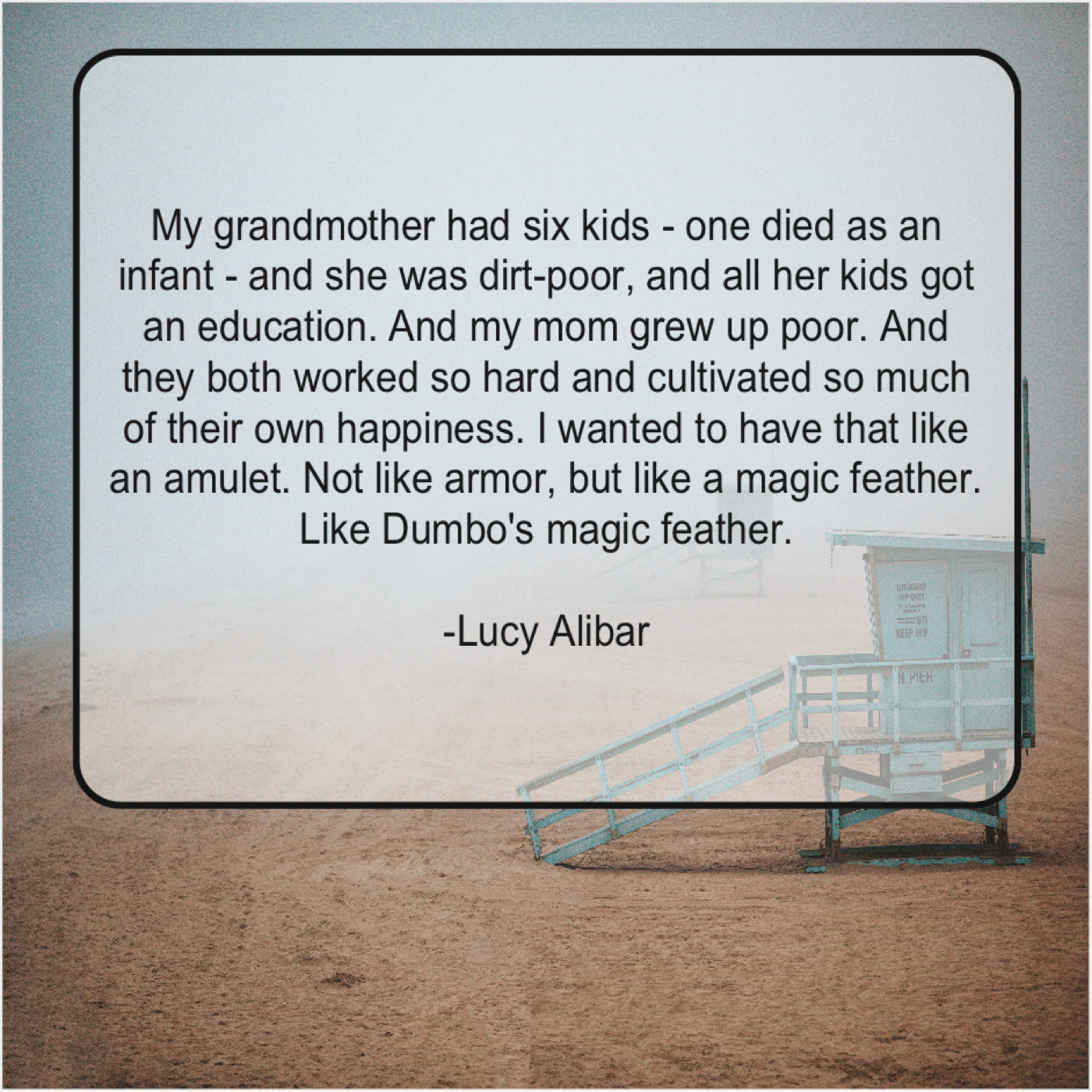 “My grandmother had six kids – one died as an infant – and she was dirt-poor, and all her kids got an education. And my mom grew up poor. And they both worked so hard and cultivated so much of their own happiness. I wanted to have that like an amulet. Not like armor, but like a magic feather. Like Dumbo’s magic feather.”