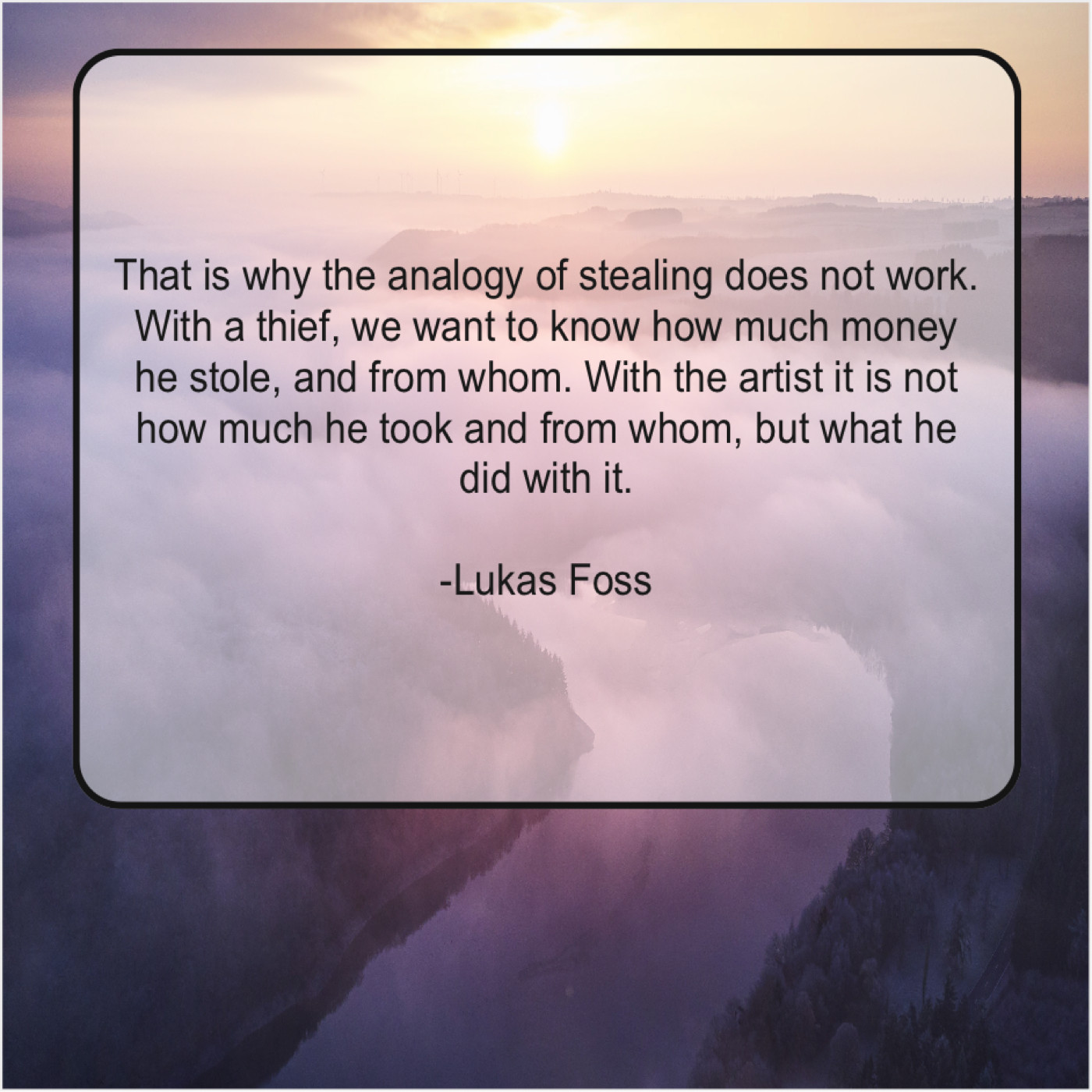 Lukas Foss Lukas Foss – That is why the analogy… September 12, 2019 admin “That is why the analogy of stealing does not work. With a thief, we want to know how much money he stole, and from whom. With the artist it is not how much he took and from whom, but what he did with it.”-Lukas Foss
