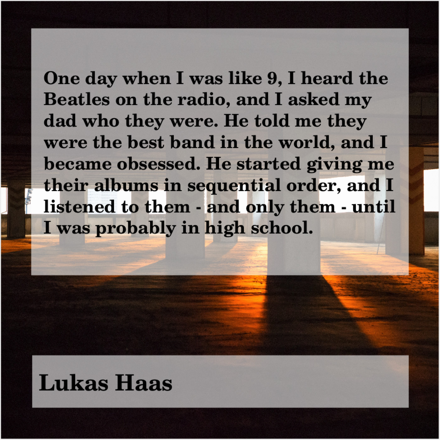 “One day when I was like 9, I heard the Beatles on the radio, and I asked my dad who they were. He told me they were the best band in the world, and I became obsessed. He started giving me their albums in sequential order, and I listened to them – and only them – until I was probably in high school.”
