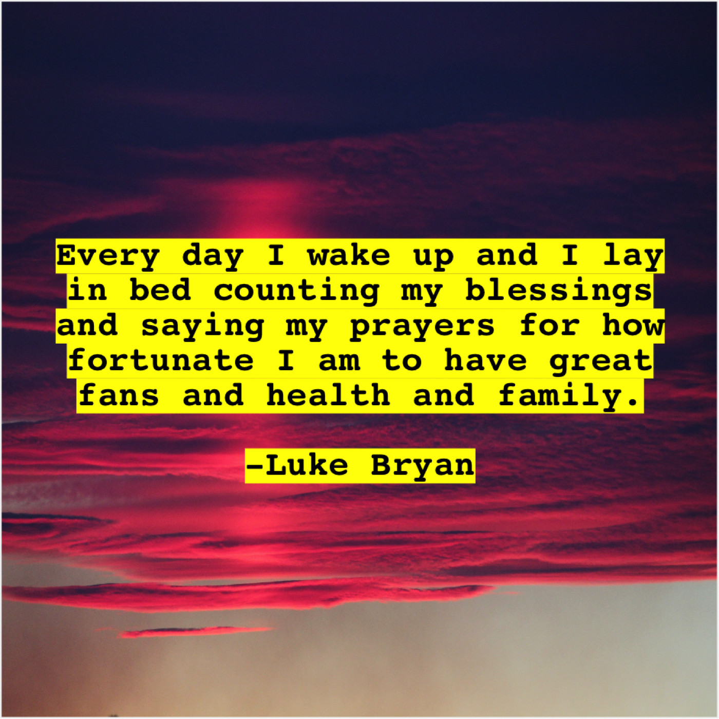 Luke Bryan Luke Bryan – Every day I wake up… August 2, 2019 admin “Every day I wake up and I lay in bed counting my blessings and saying my prayers for how fortunate I am to have great fans and health and family.”-Luke Bryan