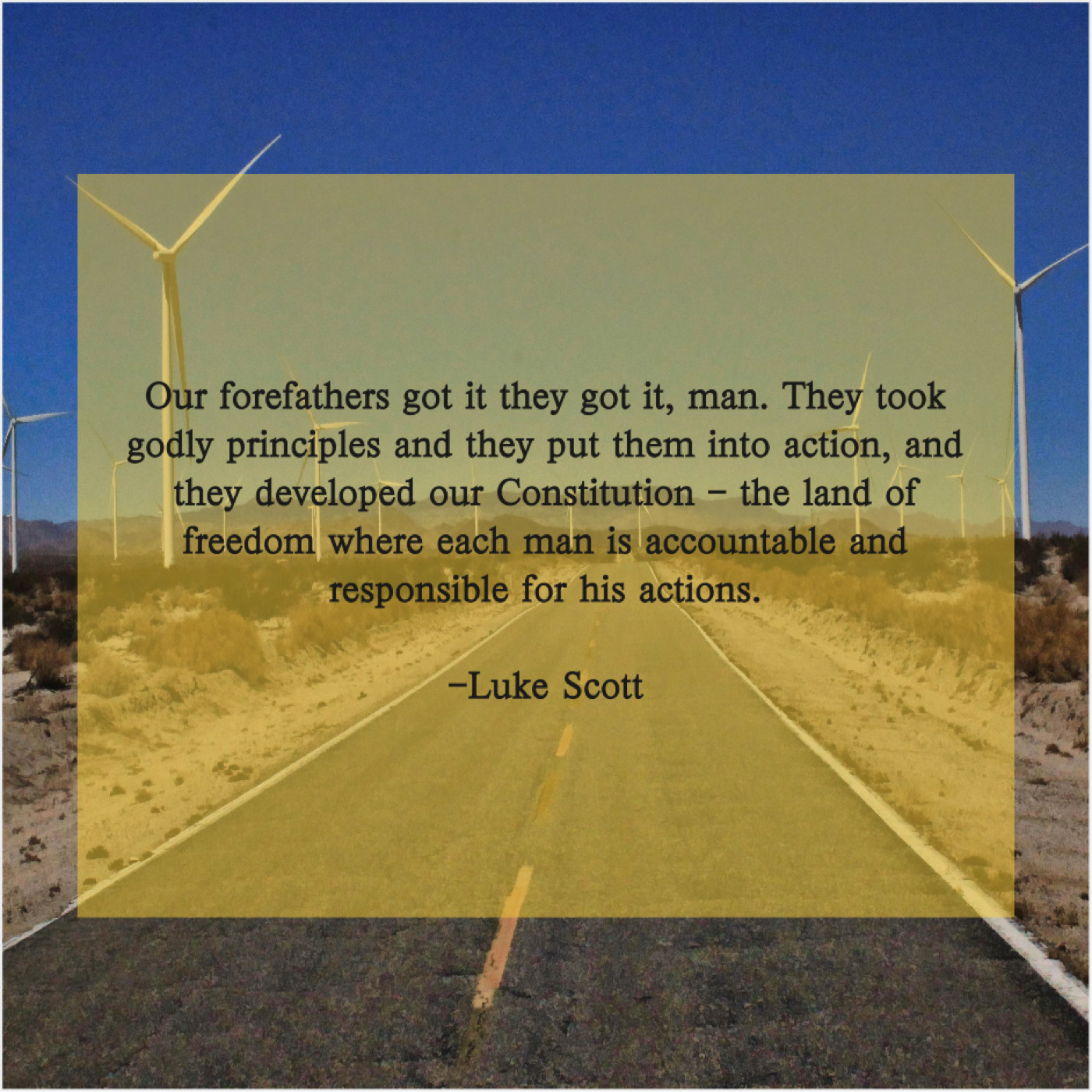 Luke Scott Luke Scott – Our forefathers got it they… September 28, 2019 admin “Our forefathers got it they got it, man. They took godly principles and they put them into action, and they developed our Constitution – the land of freedom where each man is accountable and responsible for his actions.”-Luke Scott