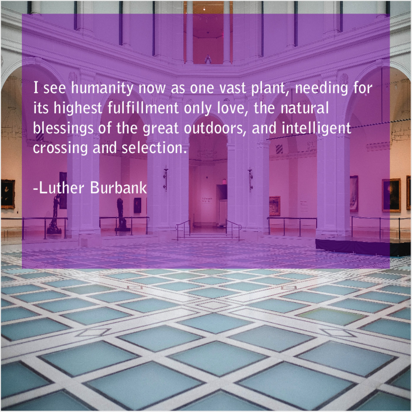 Luther Burbank Luther Burbank – I see humanity now as… May 13, 2019 admin “I see humanity now as one vast plant, needing for its highest fulfillment only love, the natural blessings of the great outdoors, and intelligent crossing and selection.”-Luther Burbank