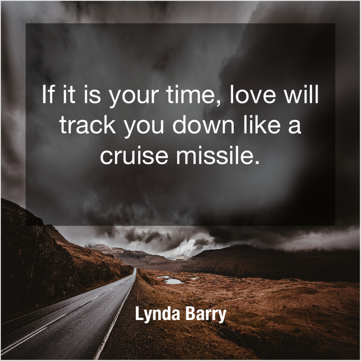 Lynda Barry Lynda Barry – If it is your time… April 28, 2019 admin “If it is your time, love will track you down like a cruise missile.”-Lynda Barry