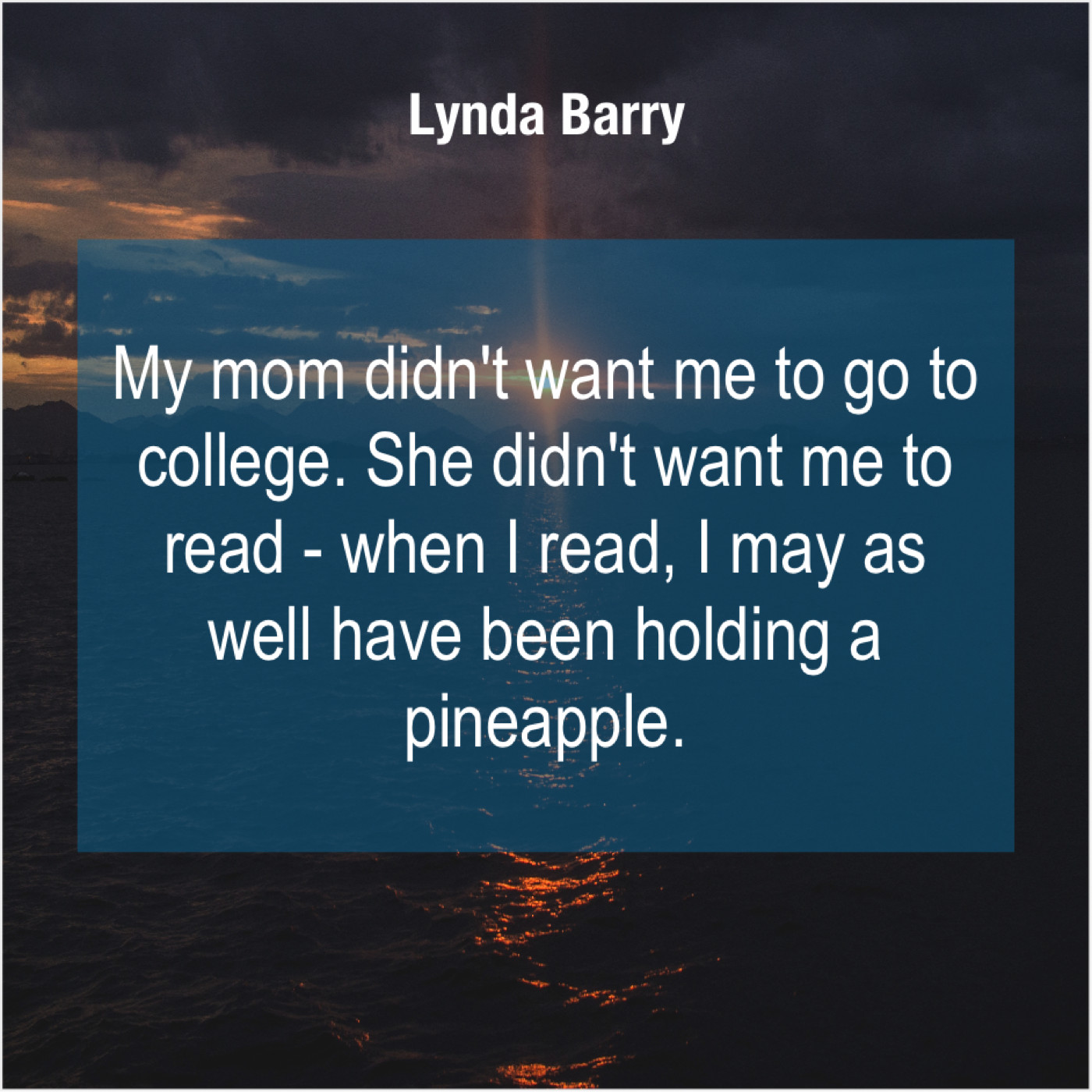 Lynda Barry Lynda Barry – My mom didn’t want me… July 11, 2019 admin “My mom didn’t want me to go to college. She didn’t want me to read – when I read, I may as well have been holding a pineapple.”-Lynda Barry
