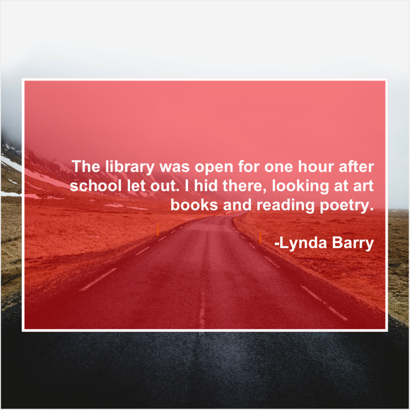 Lynda Barry Lynda Barry – The library was open for… August 6, 2019 admin “The library was open for one hour after school let out. I hid there, looking at art books and reading poetry.”-Lynda Barry