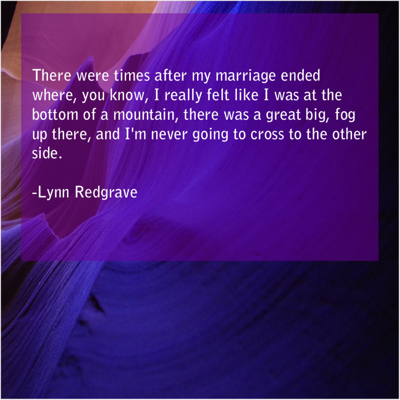 Lynn Redgrave Lynn Redgrave – There were times after my… July 14, 2019 admin “There were times after my marriage ended where, you know, I really felt like I was at the bottom of a mountain, there was a great big, fog up there, and I’m never going to cross to the other side.”-Lynn Redgrave