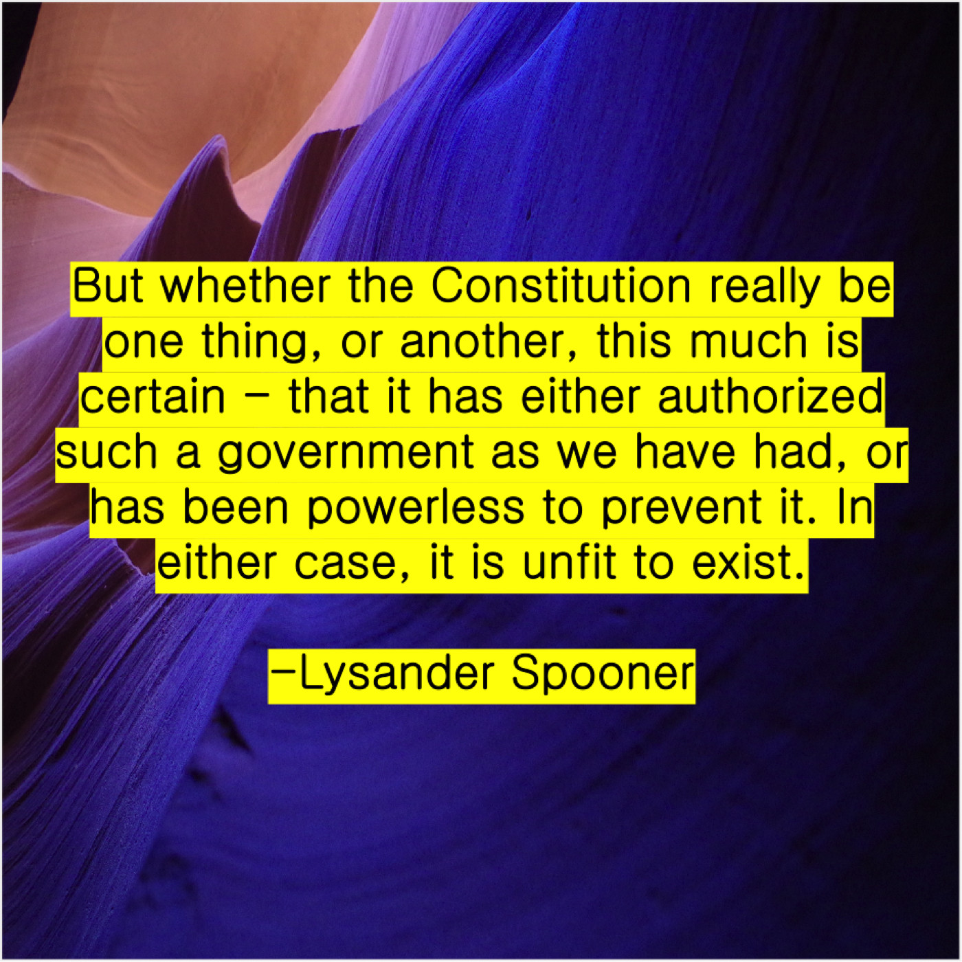 Lysander Spooner Lysander Spooner – But whether the Constitution really… February 24, 2019 admin “But whether the Constitution really be one thing, or another, this much is certain – that it has either authorized such a government as we have had, or has been powerless to prevent it. In either case, it is unfit to exist.”-Lysander Spooner