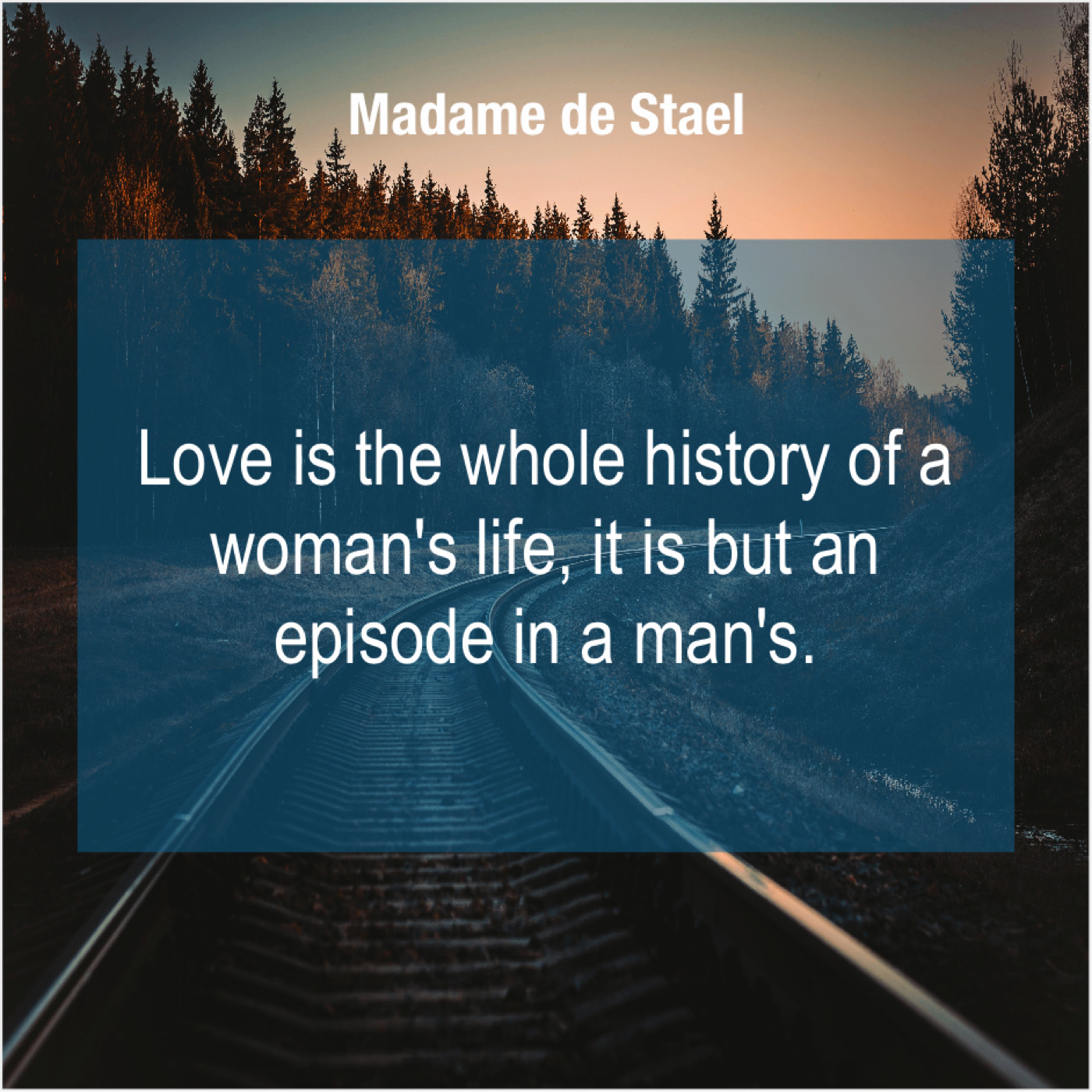 Madame de Stael Madame de Stael – Love is the whole history… April 19, 2019 admin “Love is the whole history of a woman’s life, it is but an episode in a man’s.”-Madame de Stael