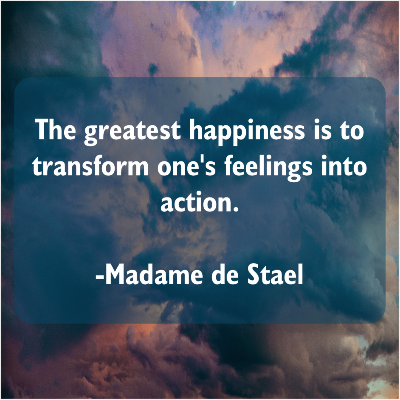 Madame de Stael Madame de Stael – The greatest happiness is to… September 25, 2019 admin “The greatest happiness is to transform one’s feelings into action.”-Madame de Stael
