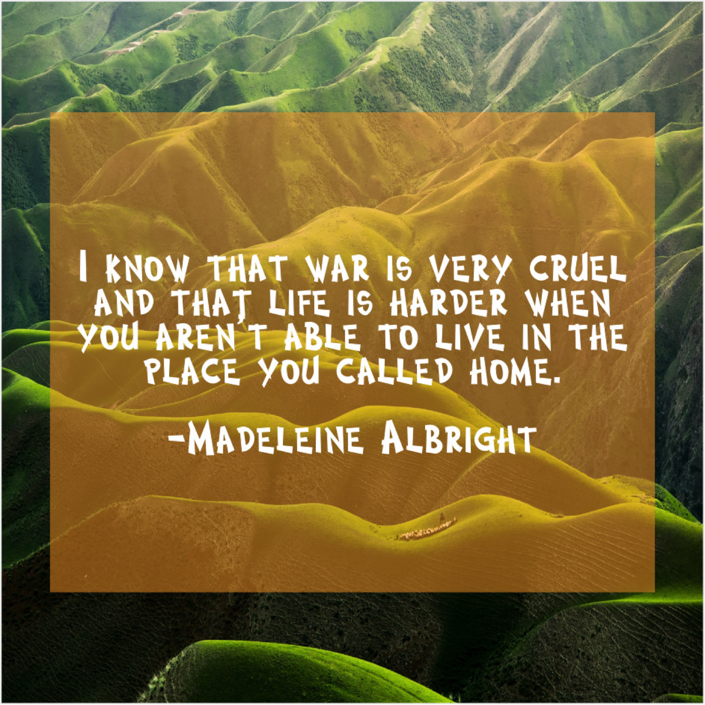 Madeleine Albright Madeleine Albright – I know that war is… October 12, 2019 admin “I know that war is very cruel and that life is harder when you aren’t able to live in the place you called home.”-Madeleine Albright