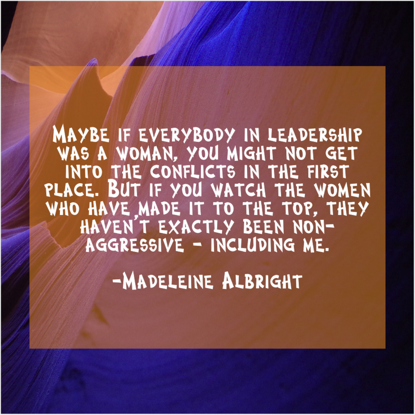 Madeleine Albright Madeleine Albright – Maybe if everybody in leadership… December 20, 2018 admin “Maybe if everybody in leadership was a woman, you might not get into the conflicts in the first place. But if you watch the women who have made it to the top, they haven’t exactly been non-aggressive – including me.”-Madeleine Albright